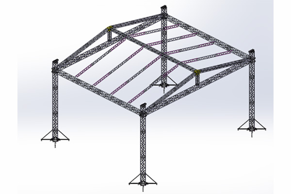 Given the budget and outdoor venue, the most economical and practical solution was chosen for the project. For the outdoor stage, a standard size of 1.22m x 2.44m is preferred. Indoors, a 1.2m x 1.2m stage is often used due to limited elevator space. For this event, nine stages were selected and arranged in a 3x3 configuration, covering an area of 7.32m x 3.66m. The truss chosen is the aluminum alloy S220, a square pin truss with a side length of 220mm. It consists of three columns (1m, 2m and 2m) with a total height of 5m, equipped with a sleeve block and top section for hoist installation, facilitating easy roof raising. Additionally, 16 column stabilizers are installed on the base.