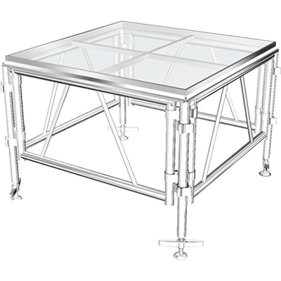 In order to ensure stability and height adjustability, we have added brace, adjustable bases and telescopic aluminum tube columns on the basis of traditional legs, stage frames, stages and necessary fasteners. The height of the base and telescopic aluminum tube columns can be adjusted during installation, with an adjustment range of 0-500mm. The conventional sizes of stage boards are 1.22*1.22 meters and 1.22*2.44 meters and are usually made of waterproof and non-slip 18mm thick plywood. The advantage of the 1.22*1.22 stage is that it can be flexibly assembled into stages of various sizes. The advantage of the 1.22*2.44m stage is that it is relatively affordable and the height can be customized according to customer requirements. The conventional adjustable heights are 0.4-0.6m, 0.6-1m, 0.8-1.2m, 1-1.5m and 1.5-2m. It can also be made into a fixed height. In addition, you can also customize transparent tempered glass and acrylic stage panels and special-shaped stages, such as round, to achieve extraordinary performance effects.